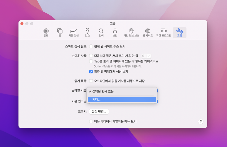 [고급]탭에 들어가서 중간 부분 아래 [스타일 시트]에서 [기타] 클릭한다.